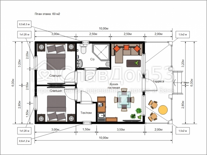 С наружной стороны обшиты имитацией бруса с прокладкой ветро-влагозащиты Наноизол А (или аналог) через контрбрус.