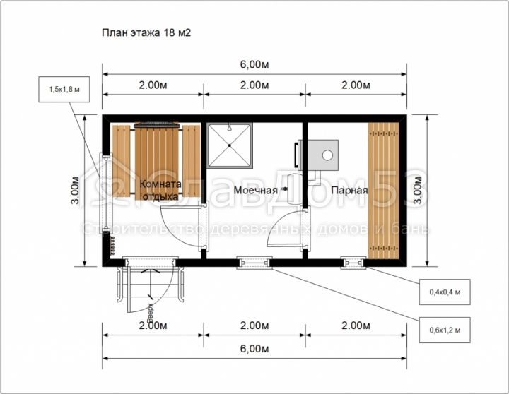 Производится установка банной печи «Ермак 16 Классик», включающая следующие компоненты: дымоход, проходящий через кровельное покрытие, сэндвич-трубы, кирпичную облицовку печного проёма, выносной бак объемом 60 литров, ППУ и экран с отражающей поверхностью.