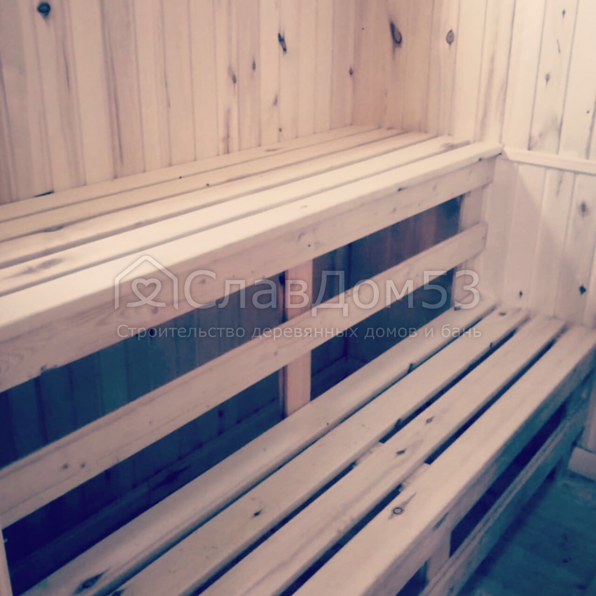 Стены и потолок обшиваются вагонкой из осины класса «Б» (стыкованная), предварительно под вагонку по периметру всех стен и потолка прокладывается фольгированная кашированная бумага, устанавливаются двухъярусные прямые полки из строганной осины класса «Б»