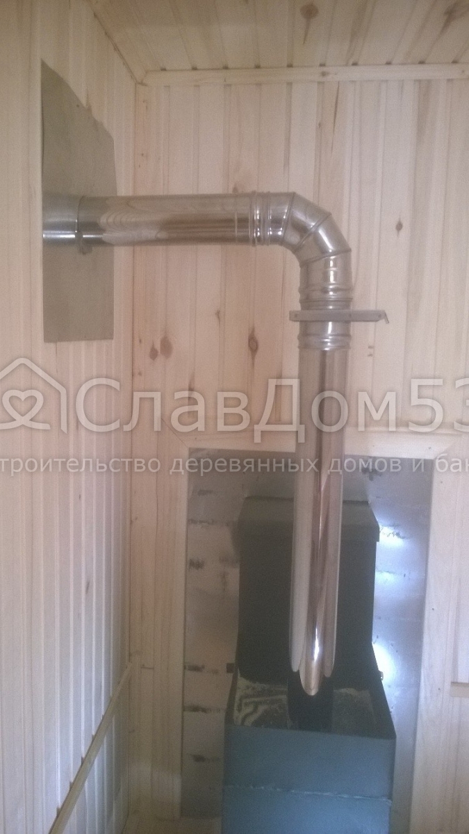 Устанавливается металлическая печь «Каменка» со встроенным баком для горячей воды и дымоходом от печки через стену с искрогасителем и пожарной защитой (дымоход печи укомплектован заглушкой, стены бани возле печки при установке экранируются листами из оцинкованной стали)